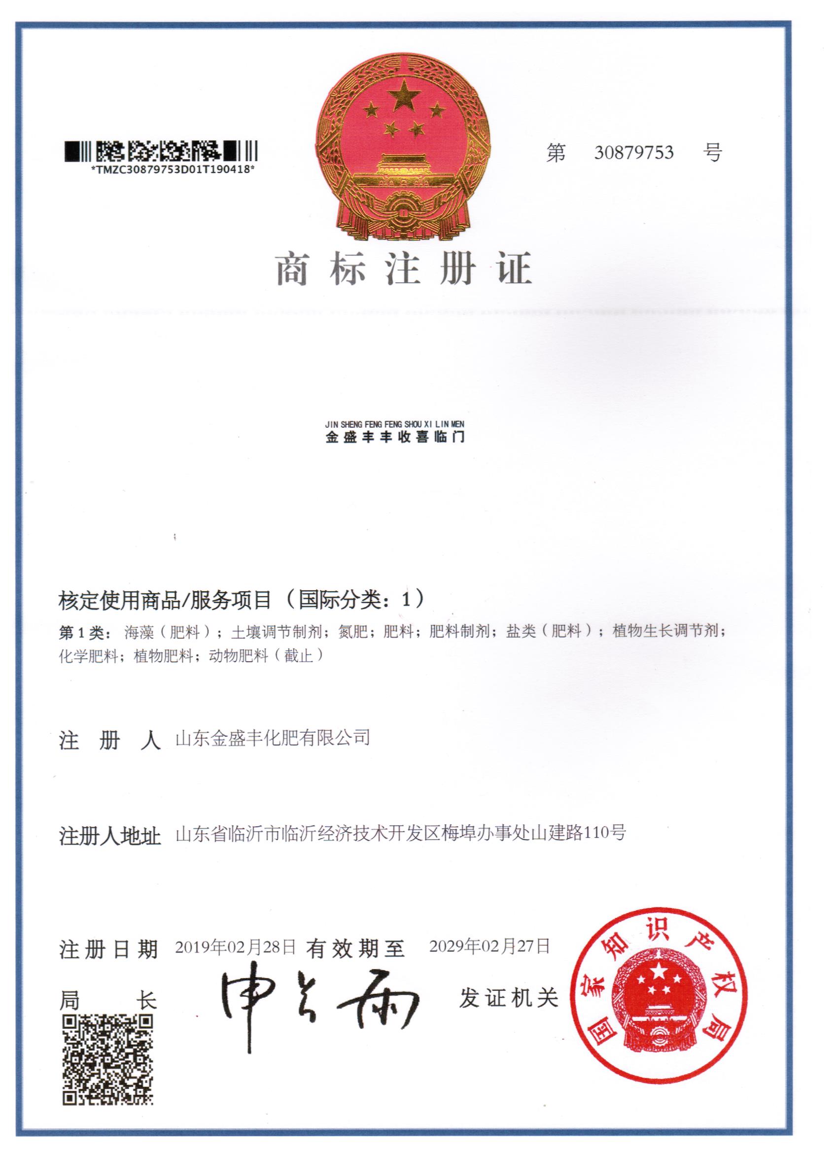 金盛豐豐收喜臨門(mén) 商標(biāo)注冊(cè)證書(shū)